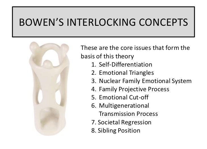 This therapy is based on the theories of psychiatrist Murray Bowen. Bowen used eight interlocking concepts to find out how birth order, a person’s role within the family, personality, and inherited traits all affect how individuals relate to each other in a family system. He defined the family both by the people within it and the way in which they interact.