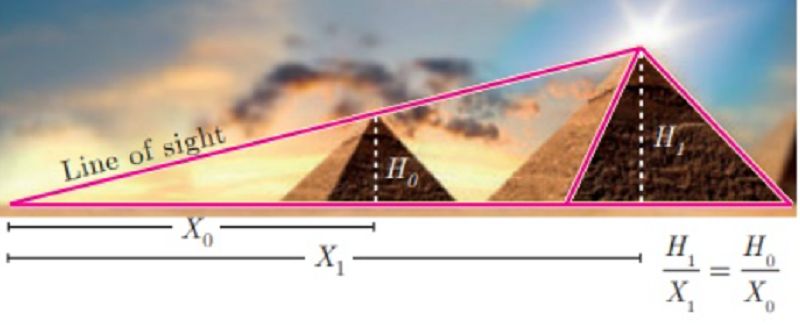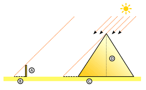 Gifted with a practical mind, Thales applied intellectual rigour to philosophy and geometry. He is credited with the discovery that the height of a pyramid can be determined by measuring its shadow. Once a day, a person’s shadow is exactly the same length as their height. Thales noted that if a pyramid’s shadow is also measured at this critical moment, the height of the pyramid is revealed.