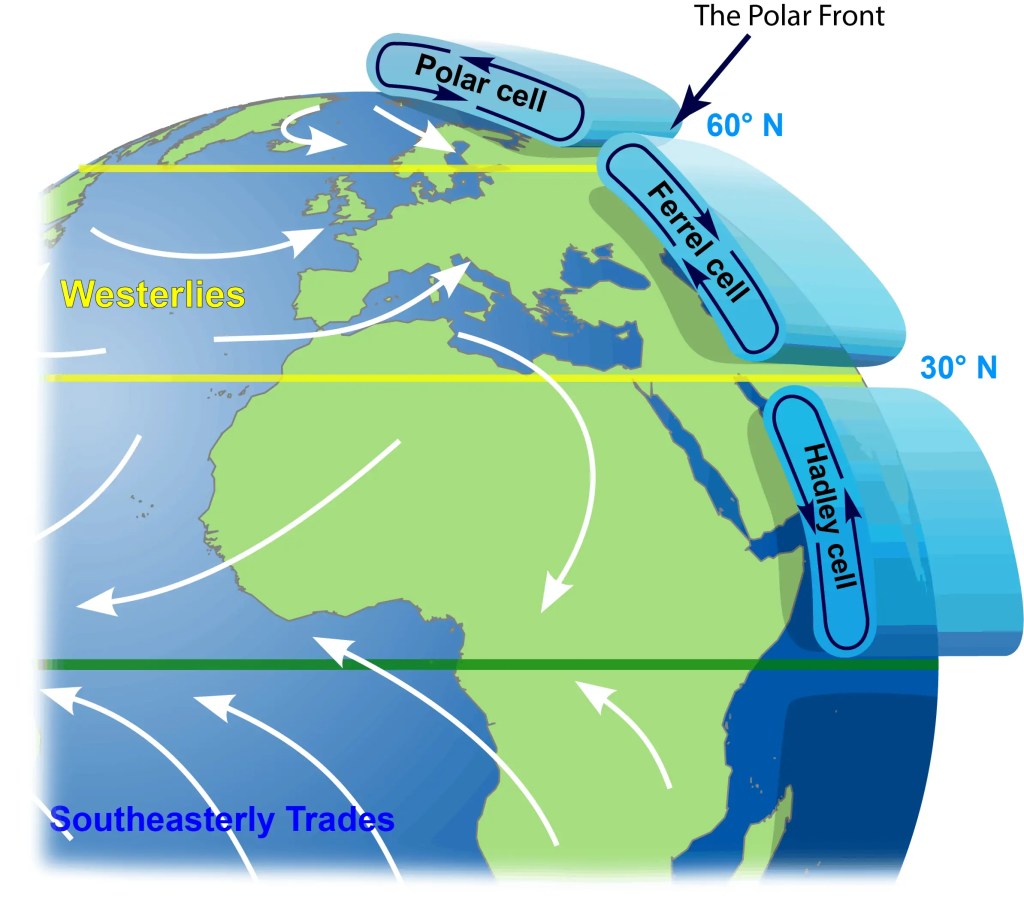 Ferrel cells, first proposed by 19th-century American meteorologist William Ferrel, are convection cells that operate at mid-latitudes but rotate in the opposite direction to polar cells and form westerlies due to the Earth’s rotation. The jet streams – mainly the “polar jets” and “subtropical jets” – are high-altitude flows of fast-moving air that form at the boundaries between the cells and rotate towards the east.