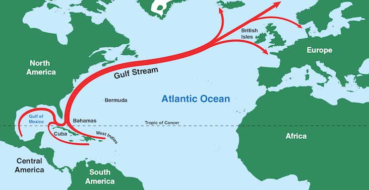 Ocean currents act like giant conveyor belts to transfer heat from the tropics to the poles. Cold deep water rises and warms in the central Pacific and the Indian Ocean before heading to high latitudes where it sinks and cools. An important ocean current system stretching from the southeast US to northwest Europe incorporates the Gulf Stream and the North Atlantic Drift. This helps to keep northwest Europe’s climate relatively warm.