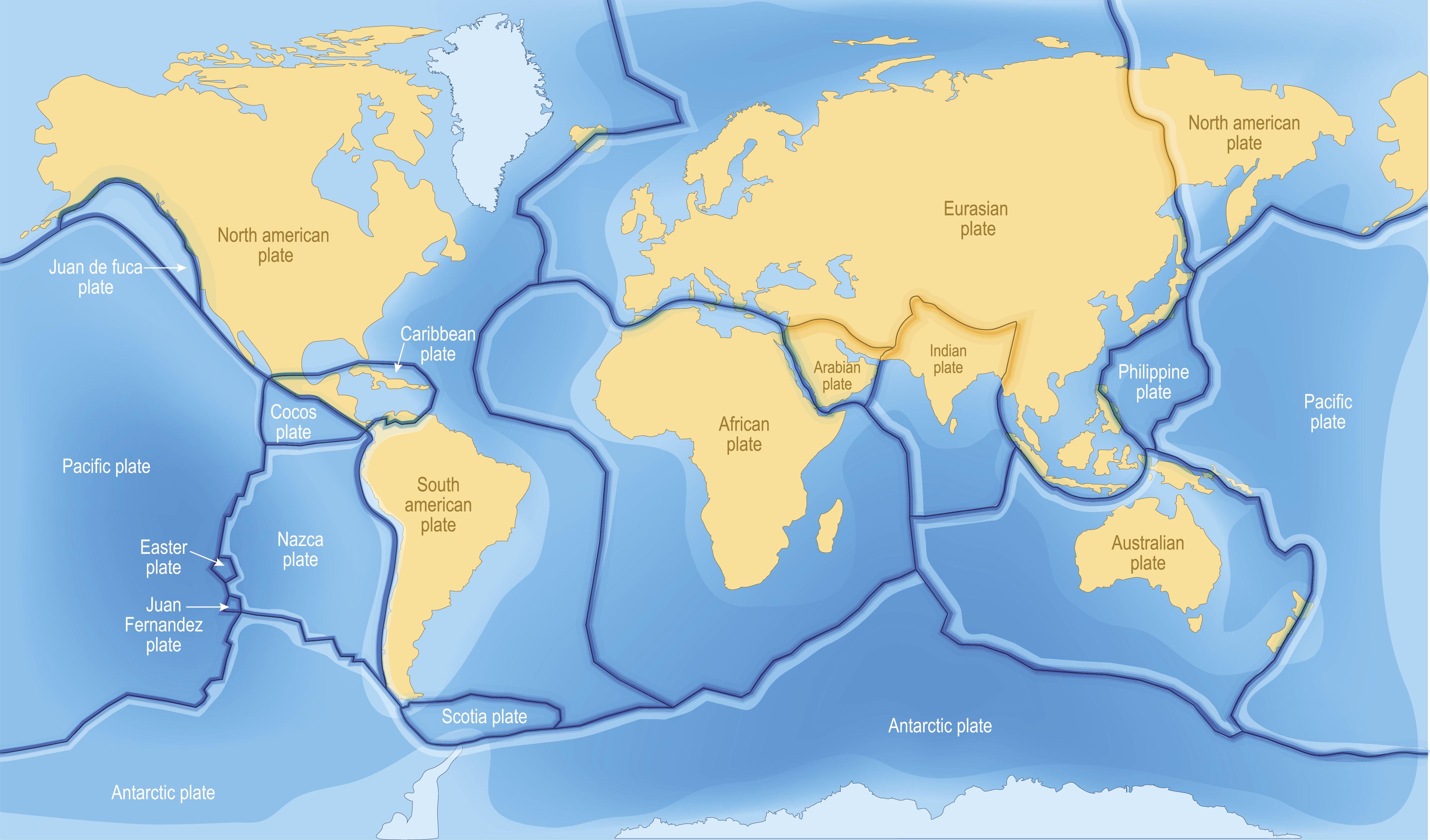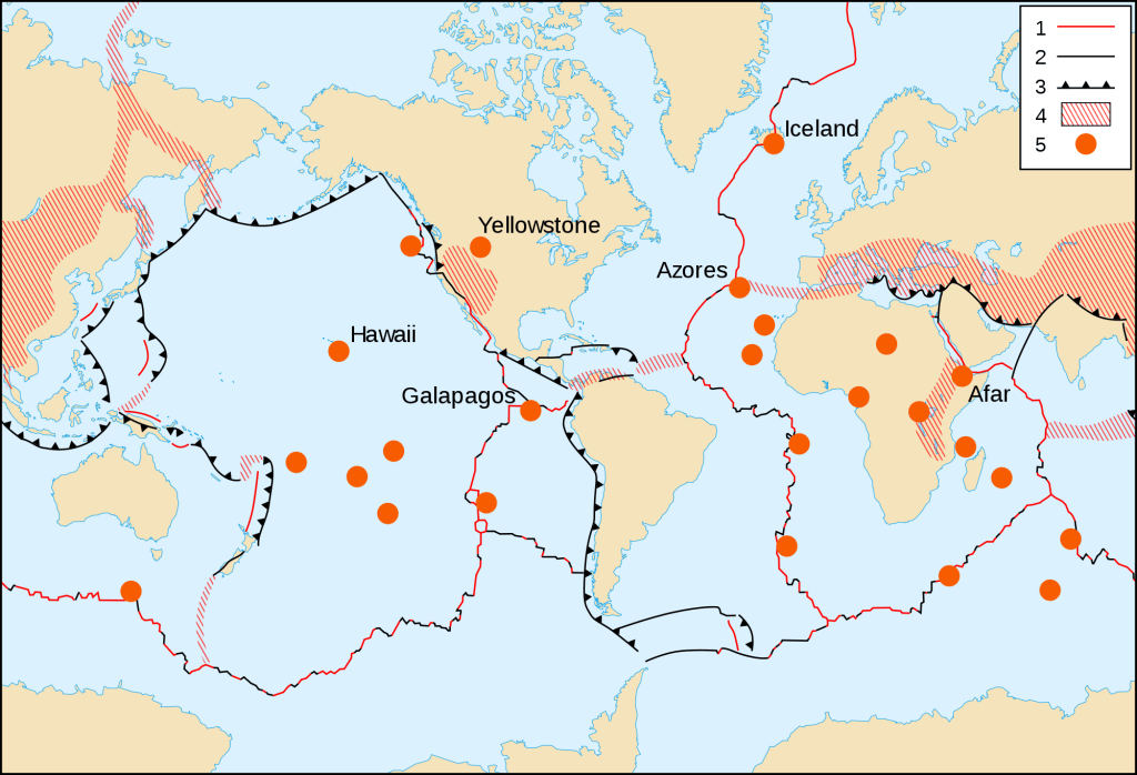 Where tectonic plates collide, mountain ranges can form, while divergent faults occur when plates move apart. “Transform boundaries” form where plates are sliding past each other. Earthquakes and volcanoes usually coincide with plate boundaries, although volcanism can also occur at “hotspots” within plate interiors, which overlie hot mantle plumes.