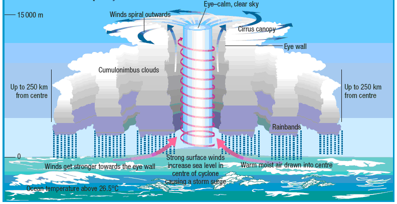 Tropical cyclones occur at low latitudes when air rotates around a centre of low pressure, fuelled by heat released when moist air rises and condenses. Major tropical cyclones are often called hurricanes or typhoons depending on location. Tornadoes are violent, funnel-shaped wind-storms that suck up debris and can persist for more than an hour. They are most common in the central US, in an area dubbed Tornado Alley.