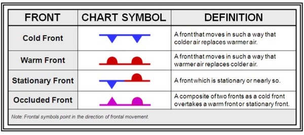 Cold fronts move faster than warm fronts and produce more sudden changes in weather because cold air is denser than warm air and replaces it rapidly. On weather maps, cold fronts are shown as lines of blue triangles pointing in the direction of travel. Light rainfall often signals the approach of a warm front, depicted as a line with red semicircles.