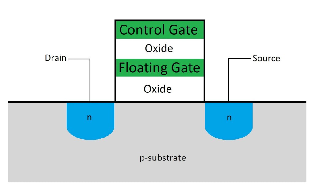 Flash memory works by switching transistors on and off to represent sequences of 0s and 1s. Unlike conventional transistors, which “forget” information when the power is off, the transistors in flash memory have an extra “gate” that can trap electric charge, registering a 1, until another electric field is applied to drain the charge and return the bit to 0.