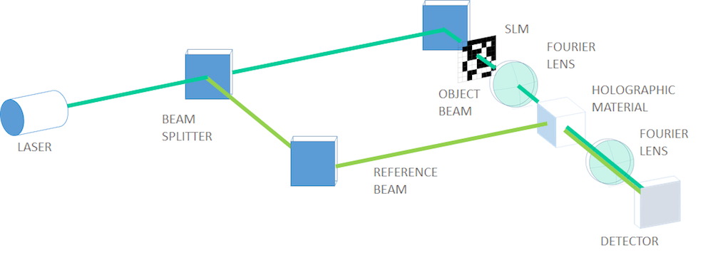 To record holographic data, a laser beam is split into two, with one ray passing through a filter carrying raw binary data as transparent and dark boxes. The other “reference” beam takes a separate path, recombining with the data beam to create an interference pattern [see: Interference described in Science Book: Physics], recorded as a hologram inside a light-sensitive crystal. To retrieve the data, the reference beam shines into the crystal at the same angle that it stored the data, to hit the correct data location inside.